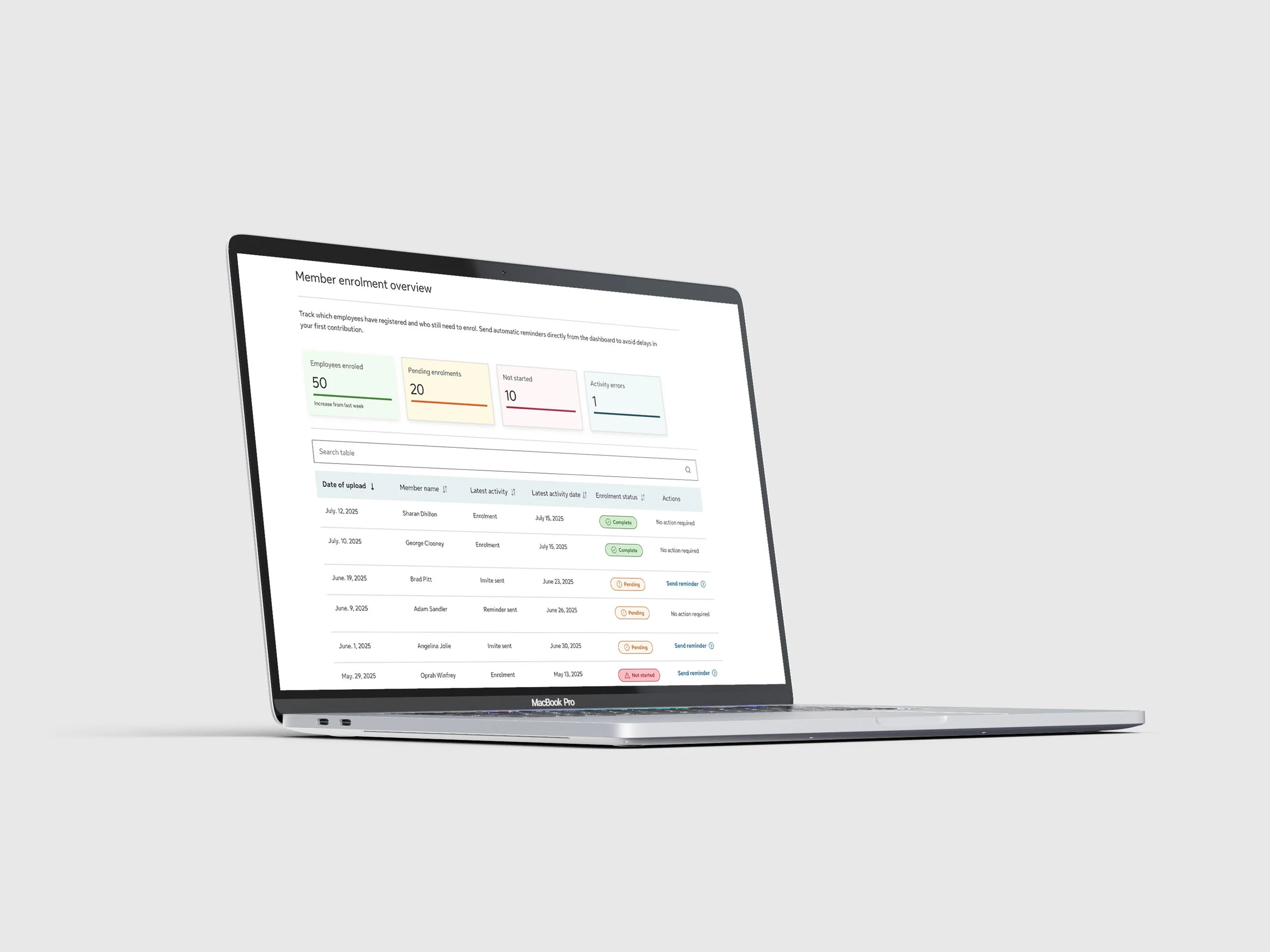 We designed the Member Enrolment Dashboard to give sponsors clarity and confidence throughout the enrolment process. Instead of manually tracking progress or chasing updates, they could now see every employee’s status in one place with key metrics, detailed views and prompts to take action.